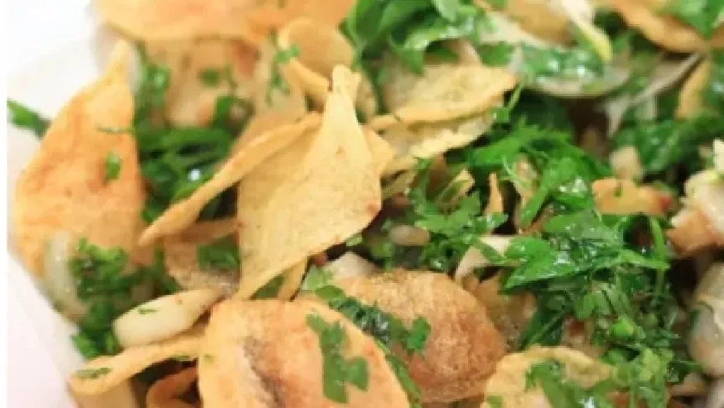 - القاعدة: بطاطس محمرة (شرائح شيبس مقرمشة)، بصل مقطع شرائح، وبقدونس مفروم طازج.